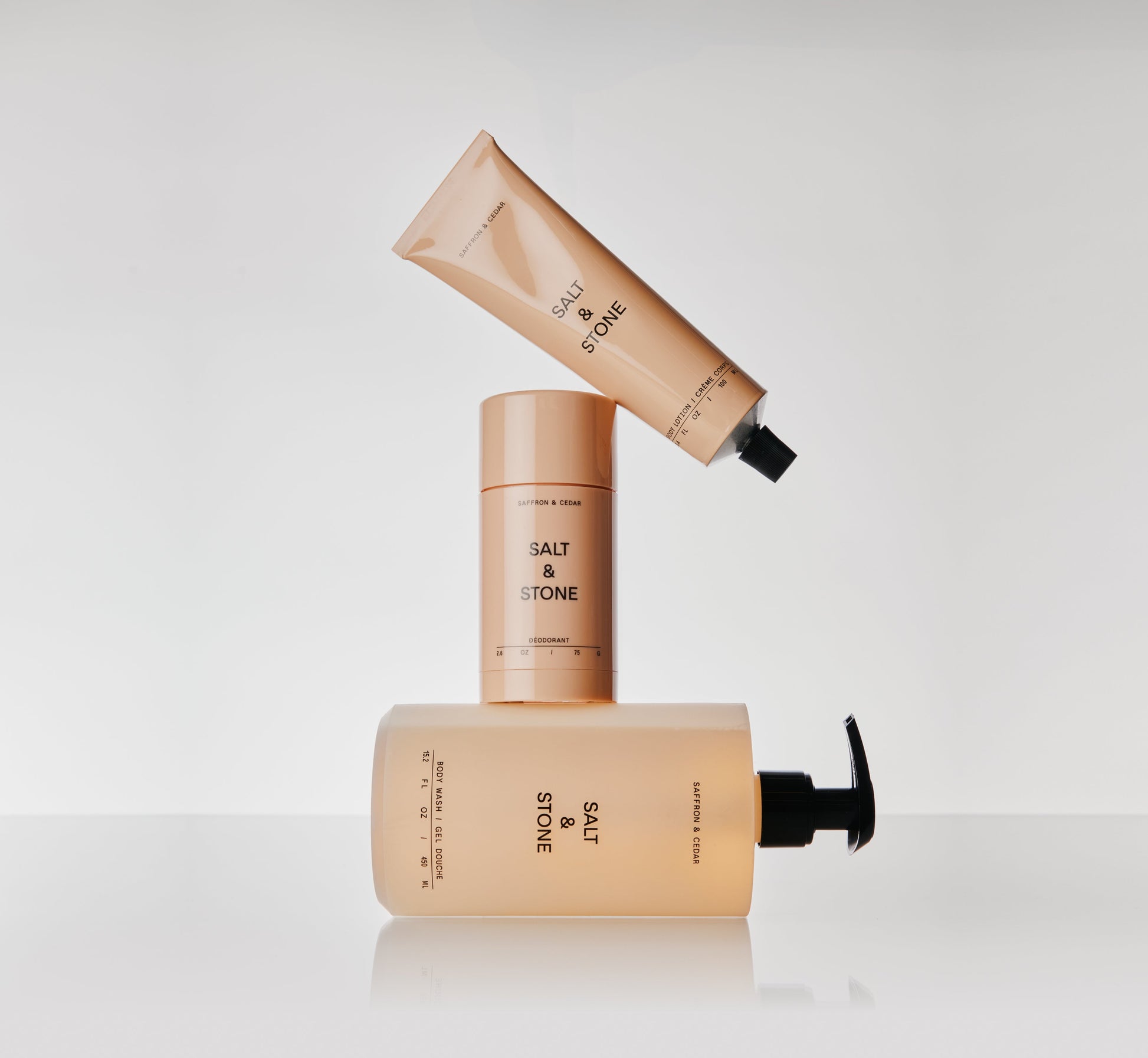 A trio of sweet, ambery Saffron essentials. Cleanse with body wash, protect with deodorant, and hydrate with body lotion.